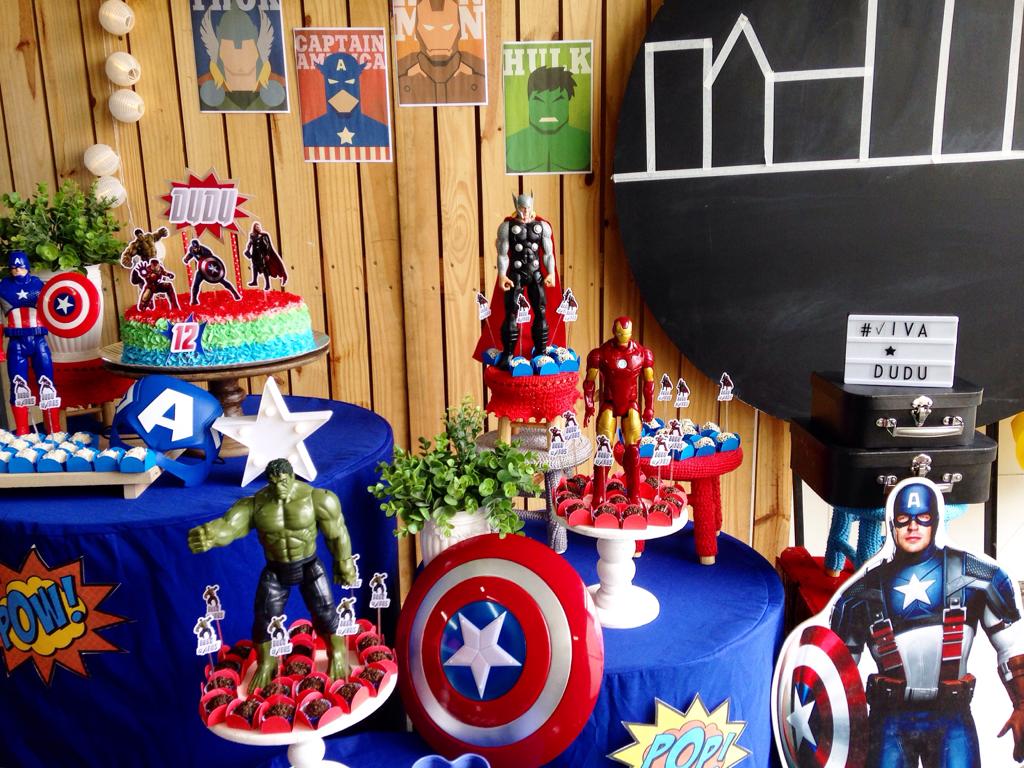 Este ano teve minitable os vingadores, com meu bolo, decoração, docinhos, lembrancinhas e papelaria personalizada.